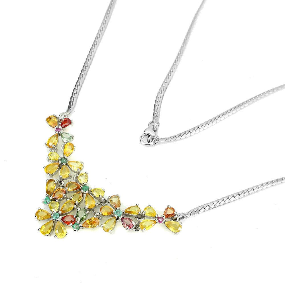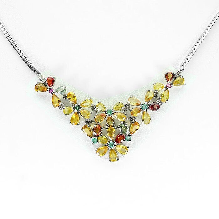 Collier mit 33 Saphiren in verschiedenen Farben, 6 Smaragden und 2 Rhodoliten gefasst in 925 Sterlingsilber 585 weißvergoldet