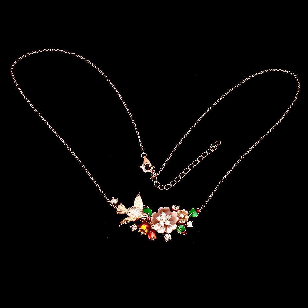 Zarte Collierkette mit einem Vögelchen, Perlmutt-Blüten, emaillierten Blumen und Blättern sowie weißen Cubic Zirconia gefasst in 925 Sterlingsilber 585 rosévergoldet