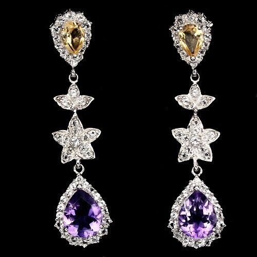 Schöne große Ohrringe mit insgesamt 2 Amethysten, 2 Citrinen und 92 Weißtopasen gefasst in 925 Sterlingsilber 585 weißvergoldet