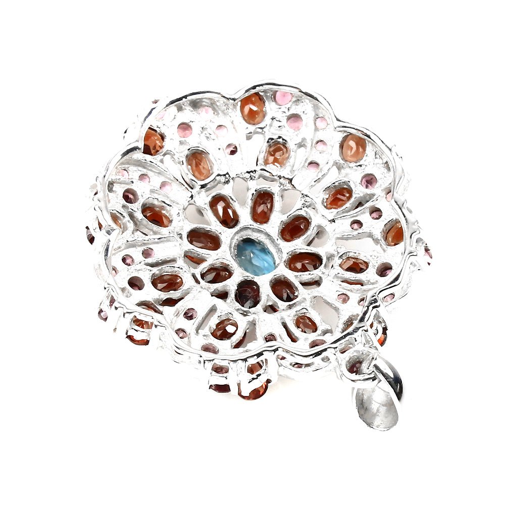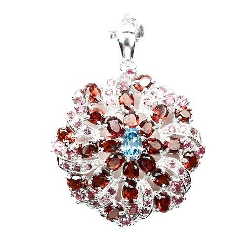 Sehr dekorativer Anhänger mit einem Blautopas in der Farbe London Blue umgeben von Granatsteinen und Rhodoliten gefasst in 925 Sterlingsilber 585 weißvergoldet