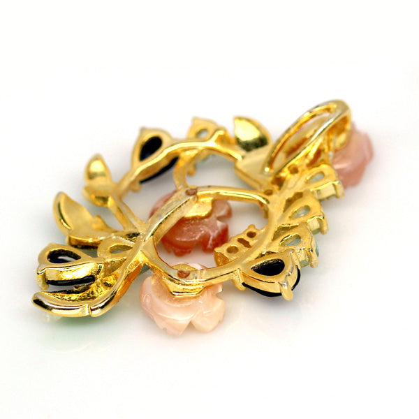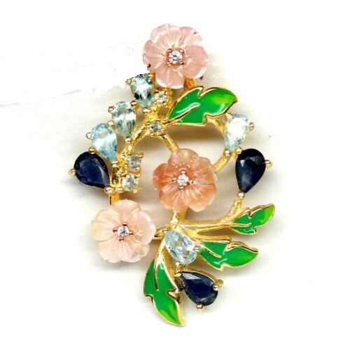 Anhänger mit 9 echten meerschaumblauen Zirkonen (keine Zirkonia!), 3 blauen Saphiren, 3 Perlmuttblüten & weißen Zirkonia gefasst in 925 Sterlingsilber 585 gelbvergoldet