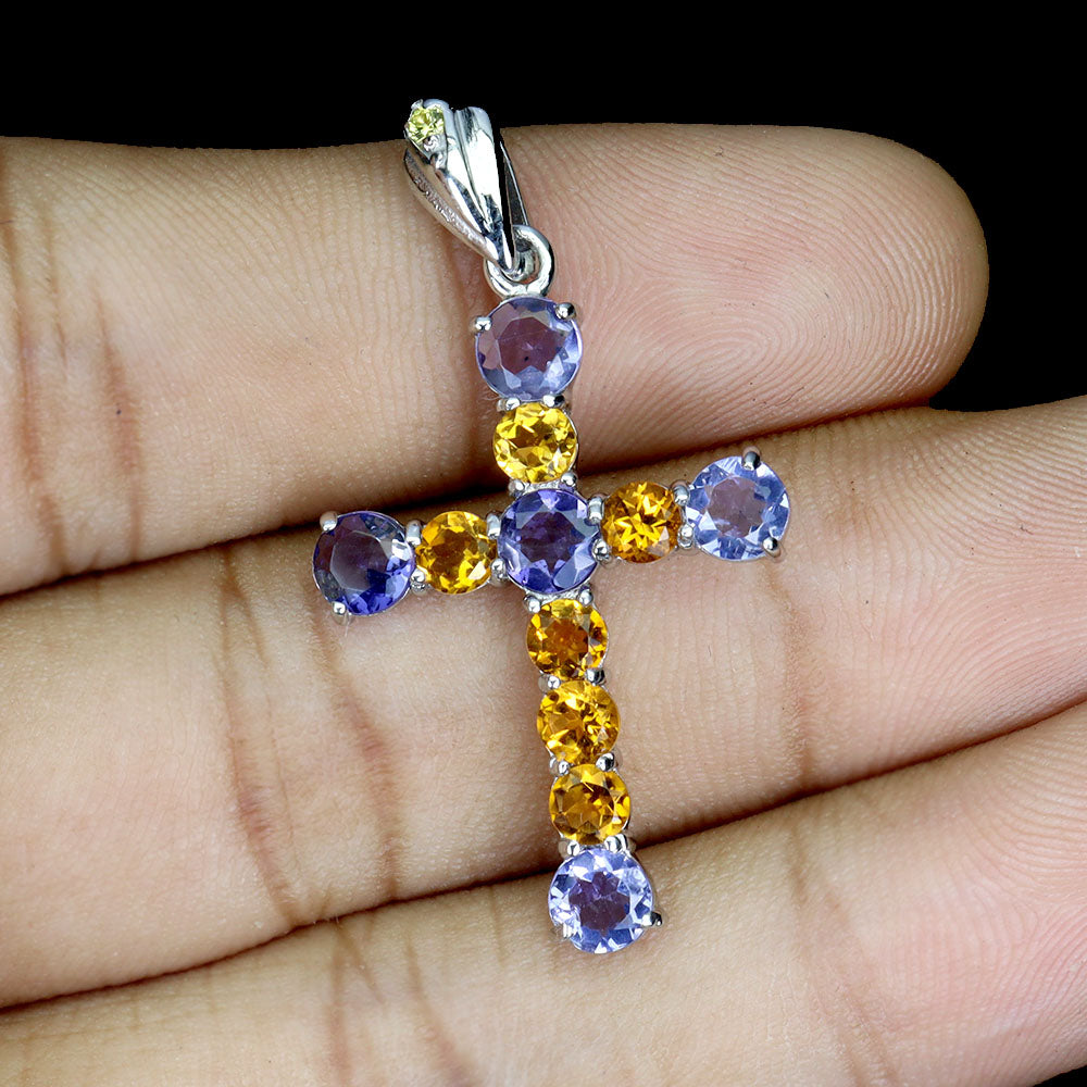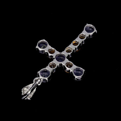 Kreuz-Anhänger mit Iolith, Citrin und gelbem Saphir gefasst in 925 Sterlingsilber 14 Karat Weißgold vergoldet