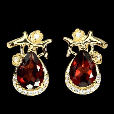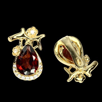 Sehr schön floral gestaltete Ohrringe mit insgesamt 2 Granatsteinen & weißen Cubic Zirconia gefasst in 925 Sterlingsilber 585 gelbvergoldet