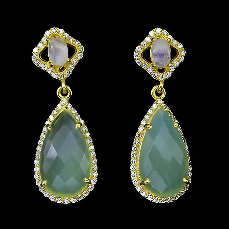 Ohrringe mit Chalzedon, Regenbogen-Mondstein & weißen Cubic Zirconia gefasst in 925 Sterlingsilber 14 Karat Gelbgold vergoldet