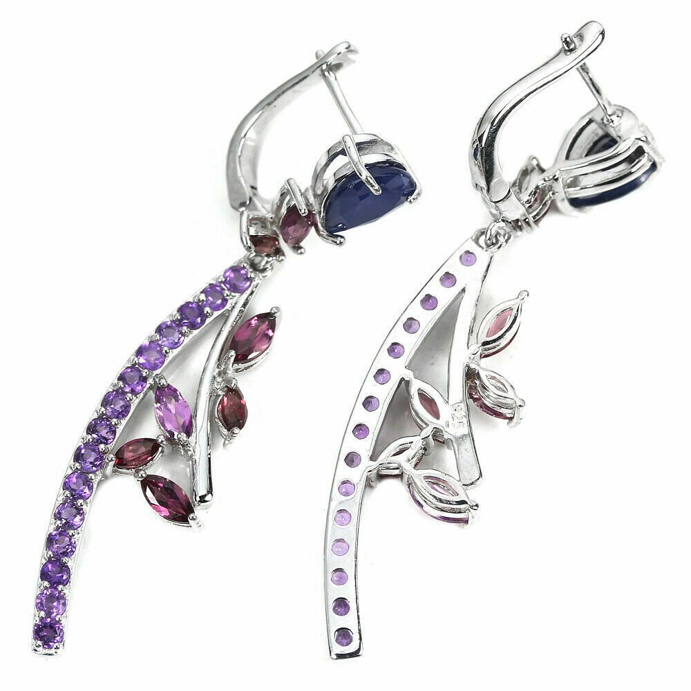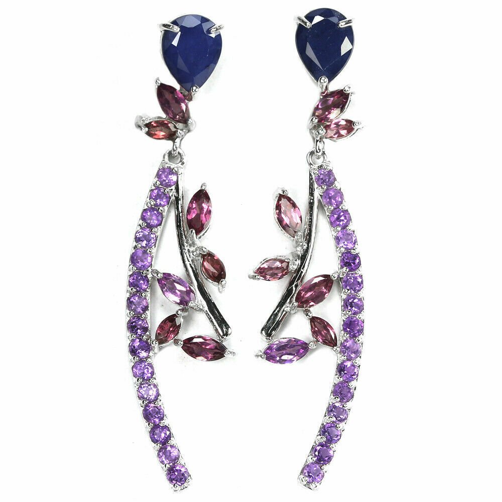 Bezaubernde Ohrringe mit insgesamt 2 blauen Saphiren, 14 Rhodoliten und 30 Amethysten gefasst in 925 Sterlingsilber 585 weißvergoldet