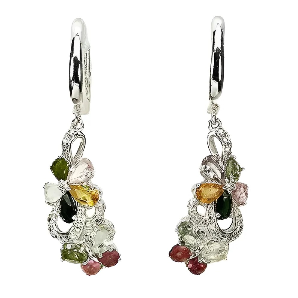 Ohrringe mit Blume und Schmetterling mit insgesamt 18 Turmalinen in verschiedenen natürlichen Farben & weißen Zirkonia gefasst in 925 Sterlingsilber 585 weißvergoldet