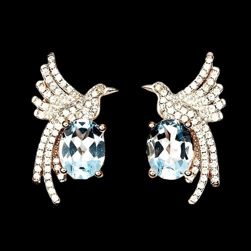 Ohrringe Vogel mit Blautopasen in der Farbe Sky Blue & weißen Cubic Zirconia gefasst in 925 Sterlingsilber 14 Karat Roségold vergoldet