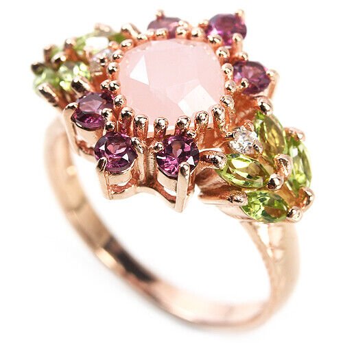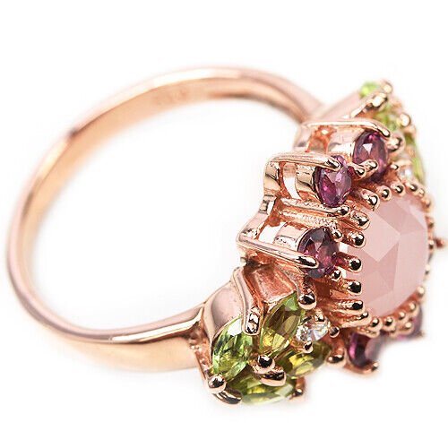 Ring mit 1 Rosenquarz, 6 Rhodoliten, 8 Peridoten & weißen Cubic Zirconia gefasst in 925 Sterlingsilber 585 rosévergoldet