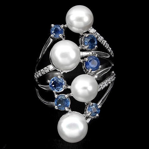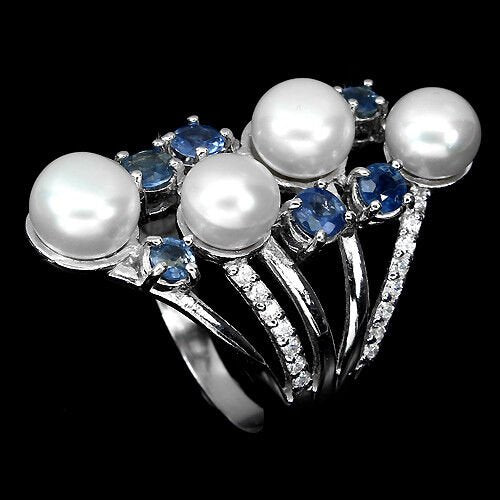 Toller Ring mit 6 blauen Saphiren, 4 weißen Süßwasser-Zuchtperlen & weißen Cubic Zirconia gefasst in 925 Sterlingsilber 585 weißvergoldet
