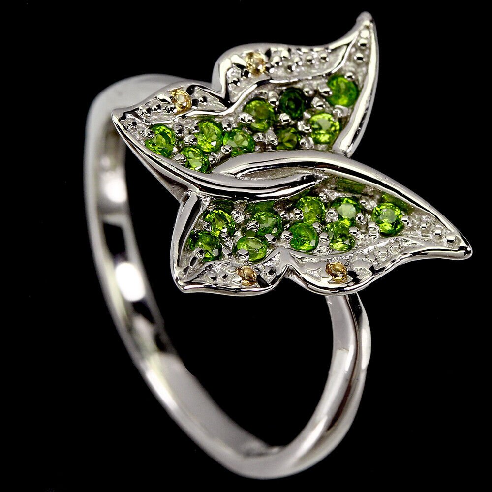 Bezaubernder Schmetterlings-Ring mit 18 russischen Diopsiden und 4 gelben Saphiren gefasst in 925 Sterlingsilber 585 weißvergoldet