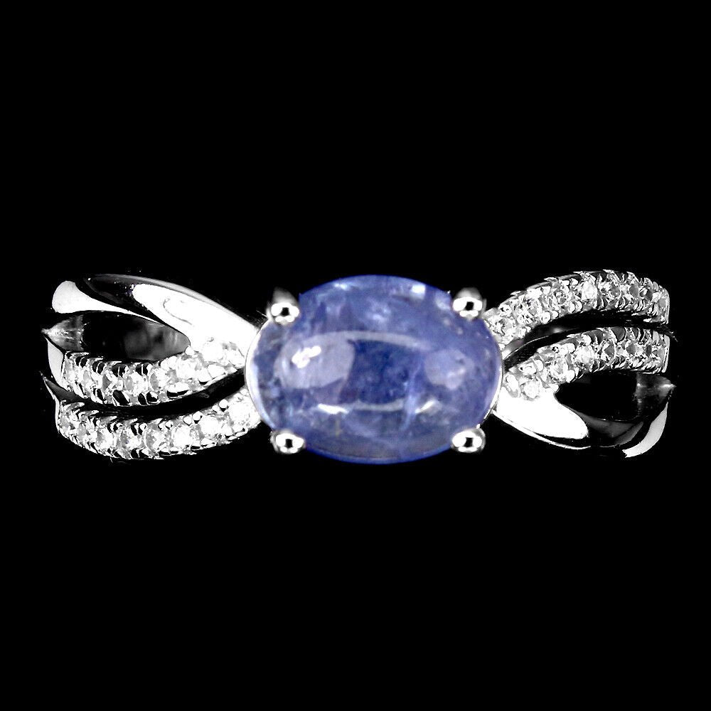 Toller Solitär-Ring mit einem Tansanit im Cabochon-Schliff & weißen Cubic Zirconia gefasst in 925 Sterlingsilber 585 weißvergoldet