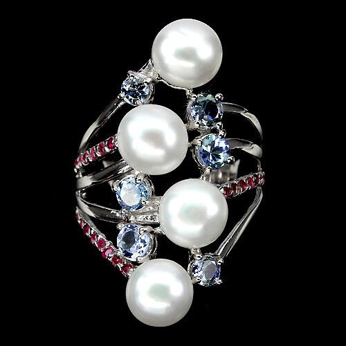 Toller Ring mit 6 Tansaniten, 22 Rubinen und 4 cremeweißen Süßwasser-Zuchtperlen gefasst in 925 Sterlingsilber 585 weißvergoldet