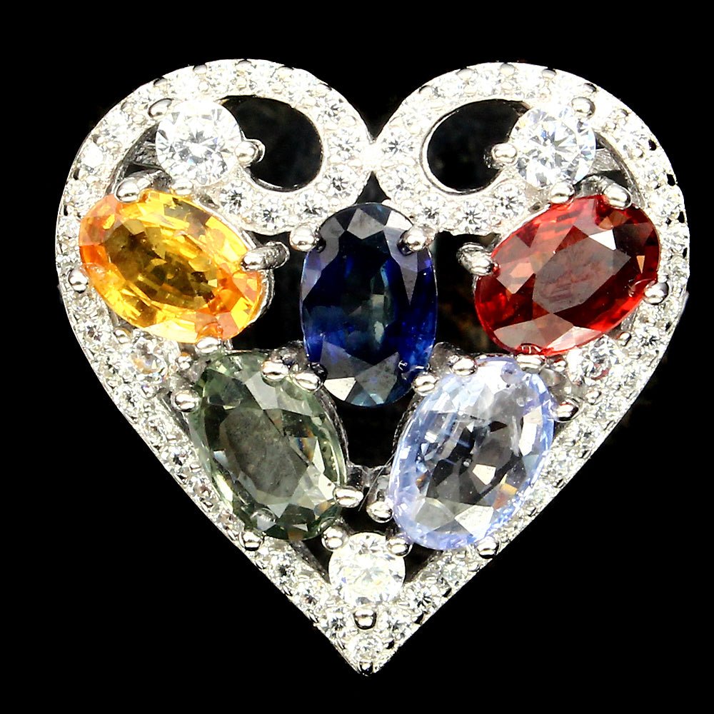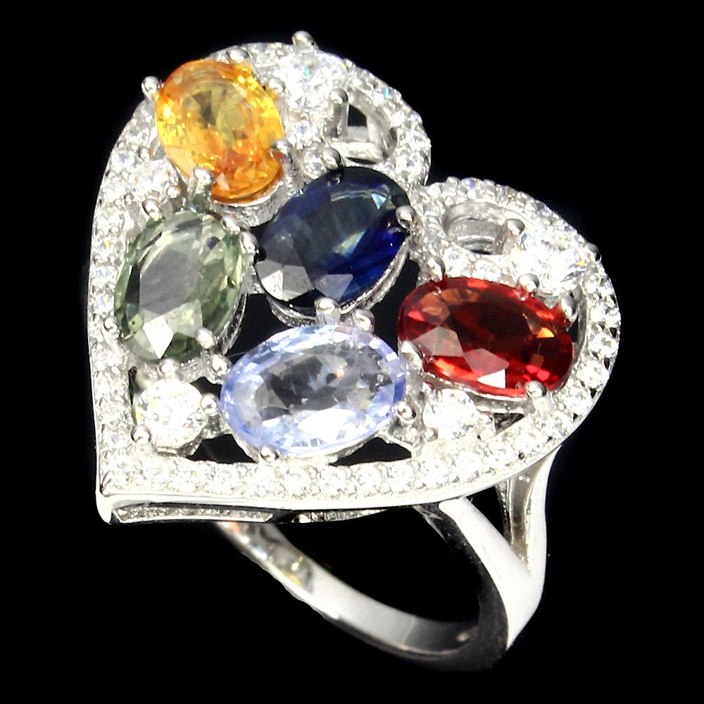 Herz-Ring mit 5 Saphiren in verschiedenen Farben & weißen Cubic Zirconia gefasst in 925 Sterlingsilber 585 Weißgold vergoldet