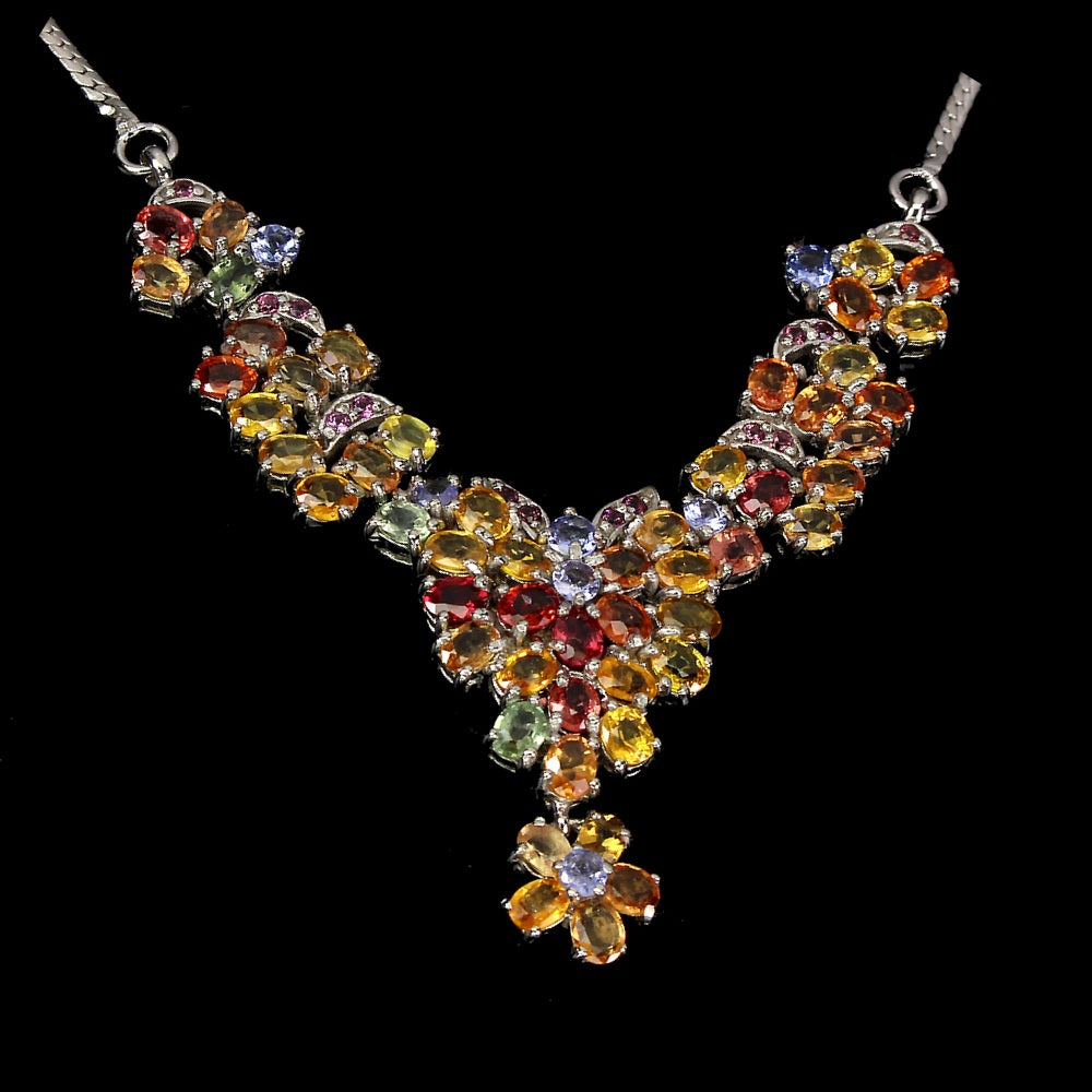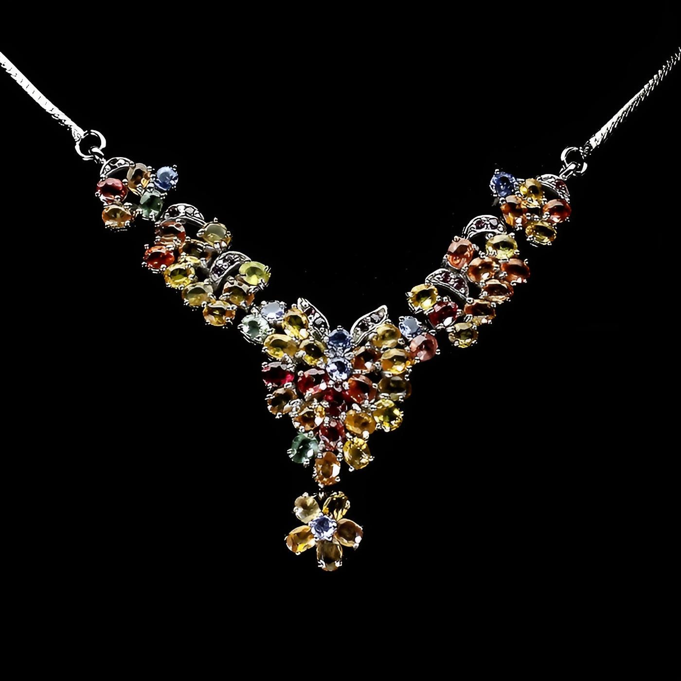 Collier mit Saphiren in verschiedenen Farben, Rhodoliten und Tansaniten gefasst in 925 Sterlingsilber 14 Karat Weißgold vergoldet