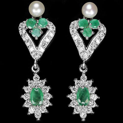 Ohrringe mit Smaragden, weißen Süßwasser-Zuchtperlen & weißen Zirkonia gefasst in 925 Sterlingsilber 14 Karat Weißgold vergoldet