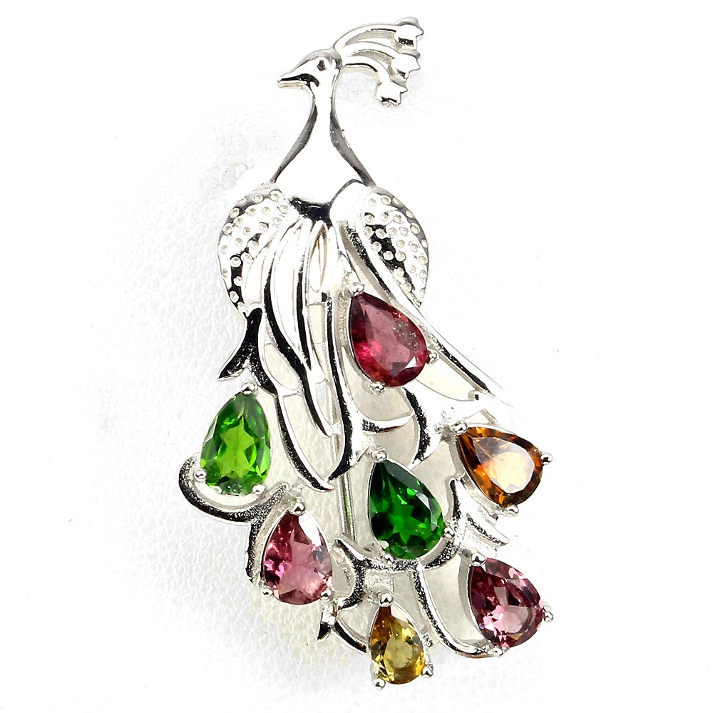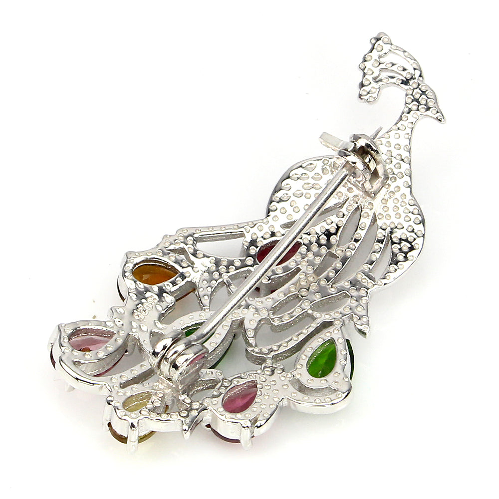 Pfauen-Brosche mit Russischem Diopsid (Chromdiopsid) und Turmalin in verschiedenen Farben gefasst in 925 Sterlingsilber 14 Karat Weißgold vergoldet