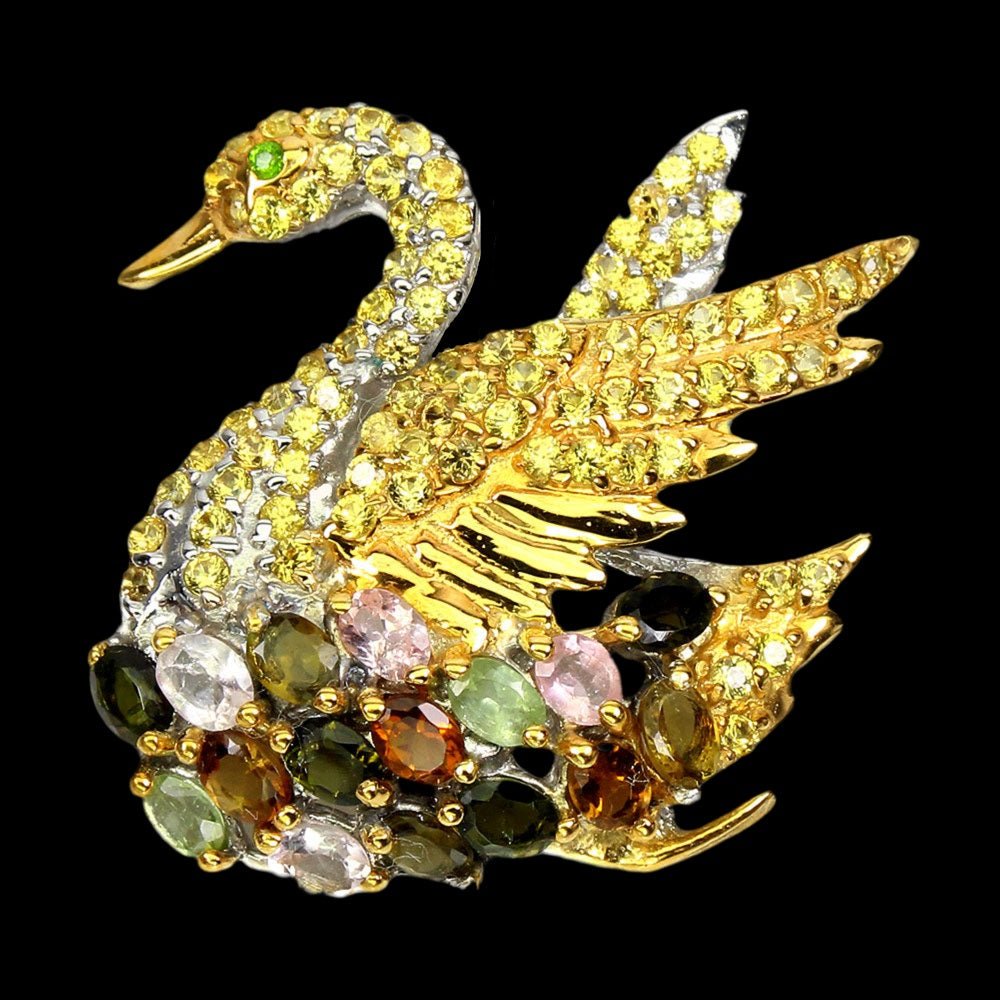 Schwan-Brosche mit Anhängeröse mit Turmalinen in verschiedenen Farben, gelben Saphiren und einem russischen Diopsid (Chromdiopsid) gefasst in 925 Sterlingsilber 14 Karat Weißgold und Gelbgold vergoldet